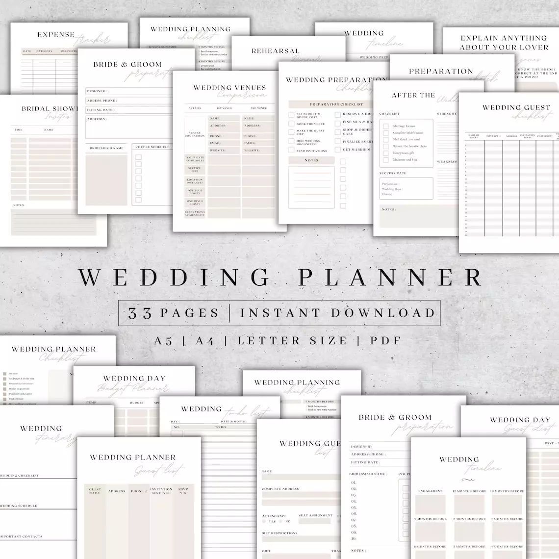 Our Wedding Planner Printable includes a comprehensive set of printable pages designed to help you manage your wedding budget, itinerary, and timeline. It covers essential aspects of wedding planning to ensure a smooth and organized process.