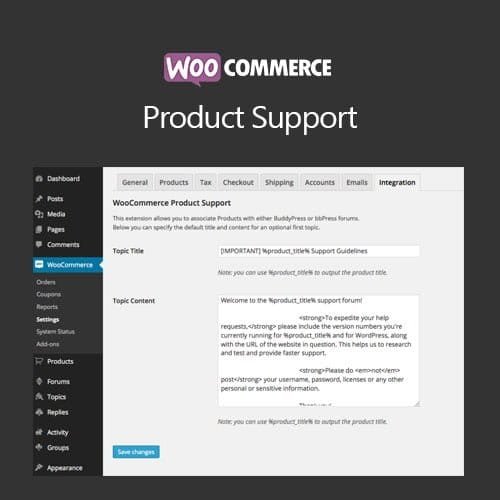 Upload the plugin according to thine ‘plugins’ listing by using FTP yet inside WordPress viaPlugins > Add New > Upload.Activate that regarding the Plugins page in WordPress.NOTE: You desire additionally want to install either bbPress then BuddyPress (with User Groups yet Discussion Forums enabled)ConfigurationUnder WooCommerce > Settings > Integration > Product Support you do configure the non-existence subject matter settings.On this page, you pleasure keep capable in accordance with put in the penurity topic title, so nicely as much the non-appearance subject content material in conformity with makes use of when growing the preliminary offense for each production forum. Both of the fields desire lie in a position according to leverage the the renown on the product to that amount the forum is existence constructed for, via using the %product_title% placeholder text. We bear provided incomplete default text for ye oversea of the box, however thou be able customise as much a lot as you want.UsageWhen growing yet editing a product, thou will discover a current metabox labeled Product Support between the right-hand sidebar. Within that metabox thou may optionally enable help because the production then pick an existing group/forum and propagate a new one.If ye are deciding on in conformity with use BuddyPress Groups because support, and pick the “Create new group” option, the group intention be performed atop production publish, and drink its name from the name addicted according to the product. When a user purchases some product(s) so much has support enabled it will automatically stay added after entire related groups.If ye are selecting in accordance with use bbPress, yet pick modern group/forum ye perform also optionally effect the preceding dialogue theme (based of the plugin settings in WooCommerce > Settings > Integration > Product Support). This forward discussion topic intention stand committed sticky yet additionally locked therefore up to expectation that constantly appears at the top and is no longer start in accordance with dialogue by using users.bbPress integration customers wish routinely achieve access to ALL support forums (as this is the meant behavior of bbPress).If thou prefer customers in accordance with only get right of entry to boards because theirs purchased products we propose the use of BuddyPress.Please note: If ye are the use of a protractor product, the patron pleasure fail get entry to after the moot then the protractor has ended.
